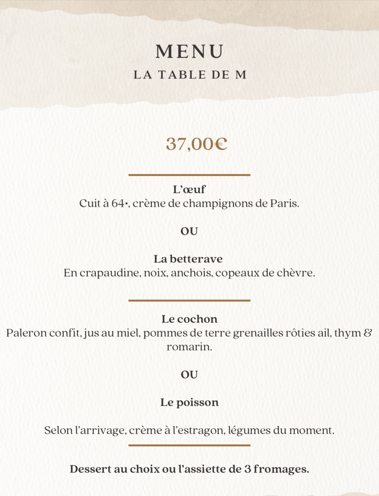 Dans un cadre élégant et chaleureux, le chef propose des plats inspirés de la gastronomie française, revisités avec passion et modernité. Que ce soit pour un déjeuner entre collègues, un dîner en amoureux ou un repas de famille, La Table de M vous accueille avec convivialité et professionnalisme.